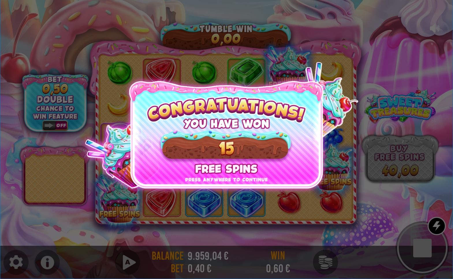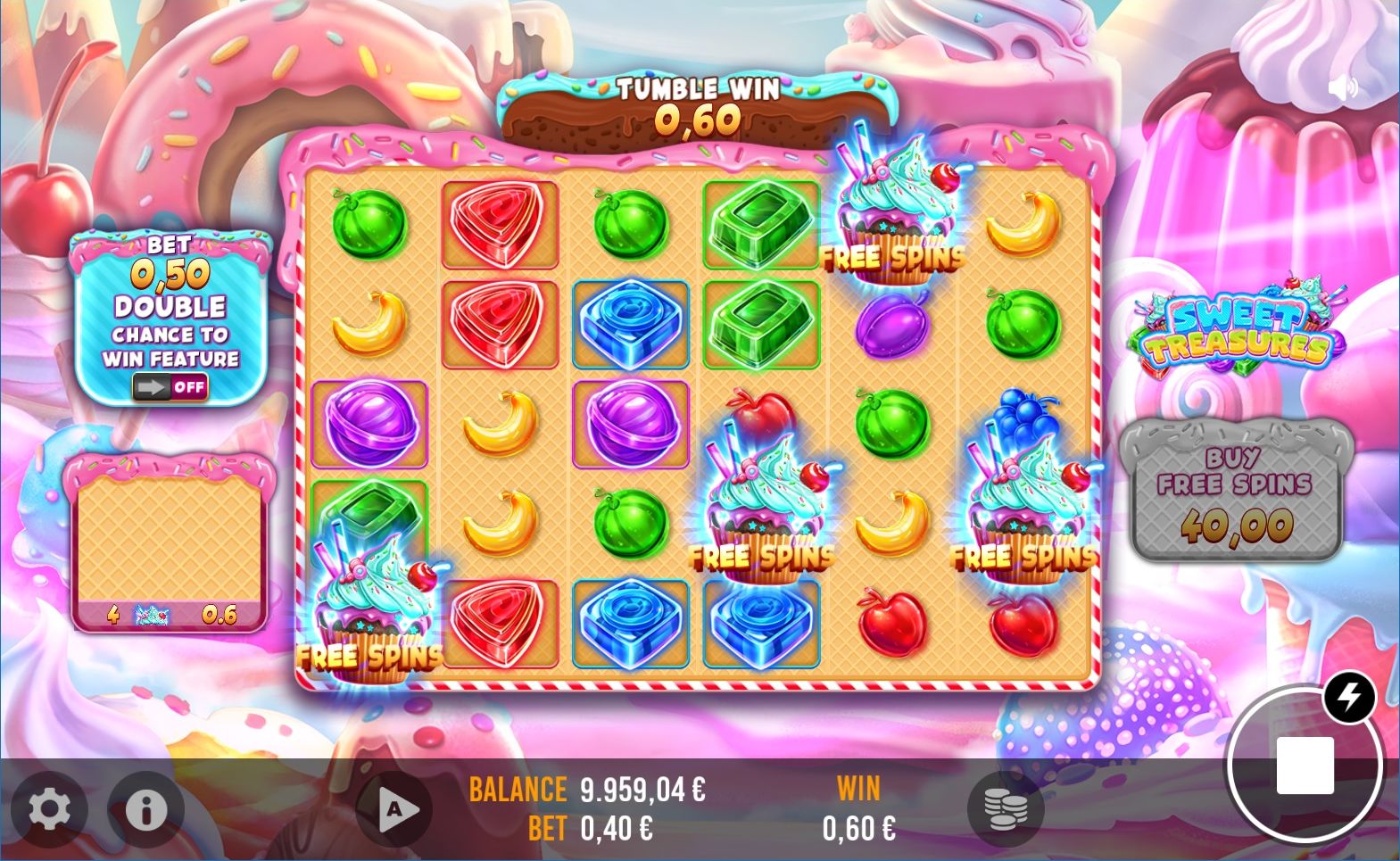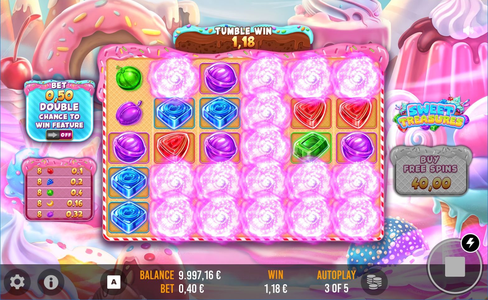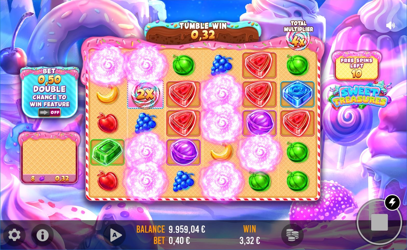 Step into the enchanting world of 'Sweet Treasures,' a captivating tumbling slot game set in a land of candy wonders. Here, colorful reels brim with sweet treats, from luscious lollipops to gummy bears, cascading to form delightful combinations. Each spin is an adventure through this sugary paradise, offering a whimsical journey filled with chocolaty delights and charming characters. 'Sweet Treasures' invites players to a delightful escapade where confectionery dreams and sugary winnings blend in a vibrant, candy-coated universe.